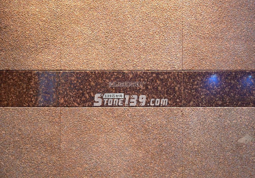 江西映山紅光面與荔枝面搭配裝飾的墻面效果 石材展會上的展品墻面效果
